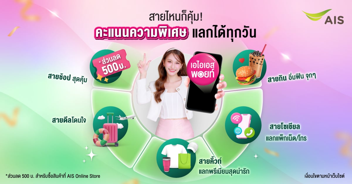 เอไอเอส พอยท์ คะแนนความพิเศษ แลกได้ทุกวัน ไม่ว่าคุณจะเป็นสายช้อป สายกิน สายเที่ยว หรือสายบันเทิง ก็สามารถใช้เอไอเอส พอยท์ให้คุ้มค่าสุดๆ กับสิทธิพิเศษมากมาย! จาก AIS