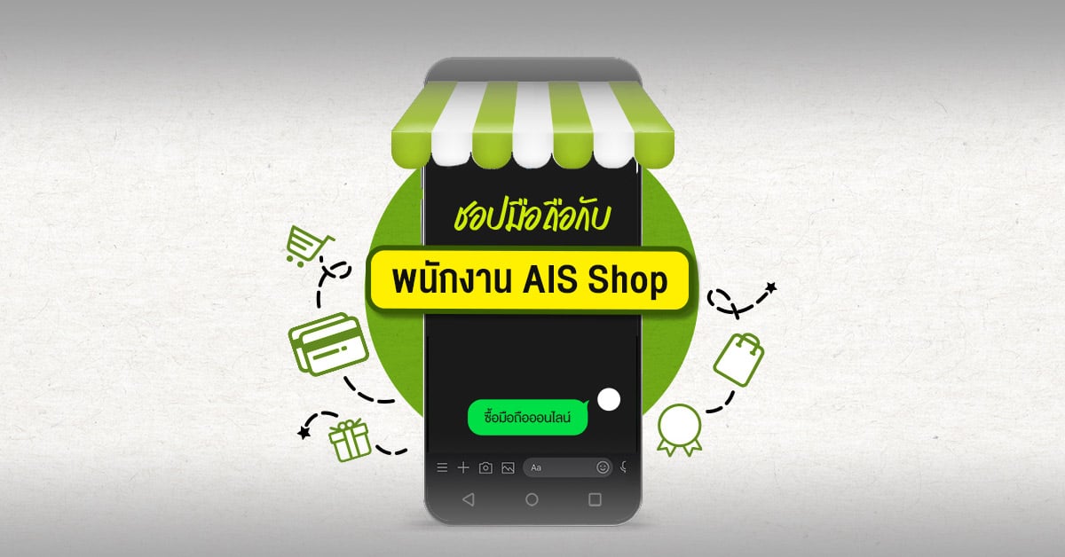 ขั้นตอนการซื้อสมาร์ทโฟนออนไลน์กับพนักงาน AIS Shop 1. แจ้งรายละเอียด รุ่น แบรนด์ สมาร์ทโฟนที่คุณสนใจ พร้อมรับข้อเสนอราคาพิเศษจากพนักงาน 2. ส่ง 'ภาพถ่ายบัตรประชาชน' และ 'ภาพถ่ายใบหน้าตรง พร้อมถือบัตรประชาชน' ให้พนักงาน 3. แจ้งที่อยู่สำหรับจัดส่งสินค้า พร้อมเบอร์ติดต่อเพื่อรับสินค้า 4. แจ้งช่องทางการชำระเงินออนไลน์กับพนักงาน ซึ่งมีให้เลือกทั้ง 5. รอรับเลขที่สำหรับติดตามพัสดุจากพนักงาน โดยประมาณระยะเวลาการจัดส่งสินค้า 6. รอรับสินค้าตามที่อยู่ที่แจ้งไว้