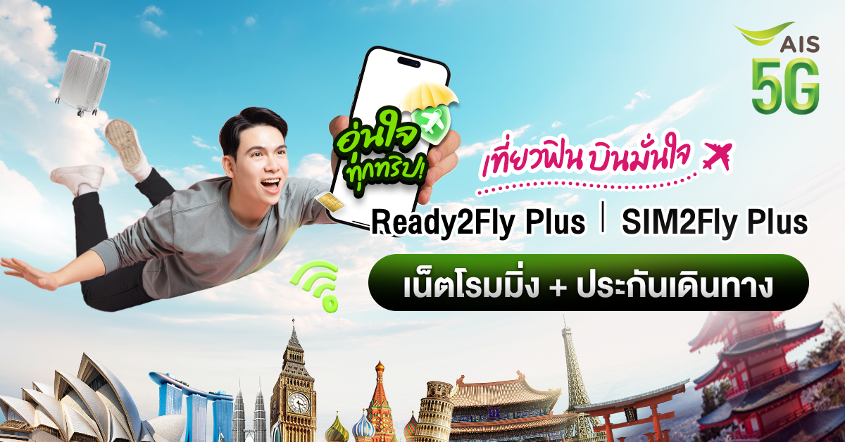 ทางออกที่ช่วยให้คุณท่องเที่ยวแบบไร้กังวล ก็คือ “เน็ตโรมมิ่ง” ที่พร้อมใช้ได้ทันที ไม่ต้องเสียเวลาหาซื้อที่ปลายทาง แค่เปิดเครื่องก็เชื่อมต่อโลกออนไลน์ได้เลย ที่สำคัญต้องคุ้มค่า ใช้งานง่าย และให้มากกว่าซิมทั่วไปนั่นคือมี “ประกันการเดินทาง” ซึ่งเป็นเหตุผลที่ Ready2Fly Plus และ SIM2Fly Plus จาก AIS เลยกลายเป็นตัวเลือกที่ตอบโจทย์นักเดินทาง