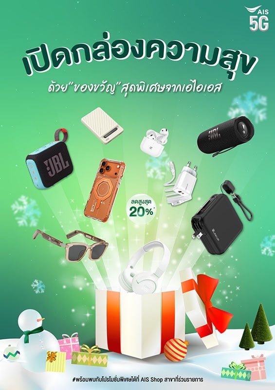 นอกจากนี้ยังขนทัพสมาร์ทโฟนแบรนด์ดัง อาทิ iPhone Air, Samsung, OPPO, Vivo มอบความสุขด้วยส่วนลดราคาพิเศษ พร้อมของแถมสุดเอ็กซ์คลูซีฟมากมาย อาทิ กระเป๋า Aristotle, AIS Care+ with Samsung Care Services นาน 1 ปี, แพ็กเกจ Play Premium Plus จุใจทุกคอนเทนต์ นาน 1 ปี, Grab Unlimited สูงสุด นาน 9 เดือน ความพิเศษนี้ตามรุ่นสมาร์ทโฟนที่ร่วมรายการ เงื่อนไขตามที่กำหนด พร้อมกันนี้ยังมอบส่วนลดสูงสุด 10% กับสินค้ากลุ่ม Smart home และลูกค้า SIM2Fly รับส่วนลดเพิ่ม 120 บาท เมื่อซื้อสินค้าครบ 1,000 บาทขึ้นไป ที่ AIS Online Store พิเศษ! ให้ลูกค้าเปิดกล่องความสุข ด้วยของขวัญสุดพิเศษจาก AIS ที่รวมกลุ่มสินค้าอุปกรณ์เสริมมือถือไว้อย่างครบครัน ดูรายละเอียดเพิ่มเติมได้ที่ www.ais.th