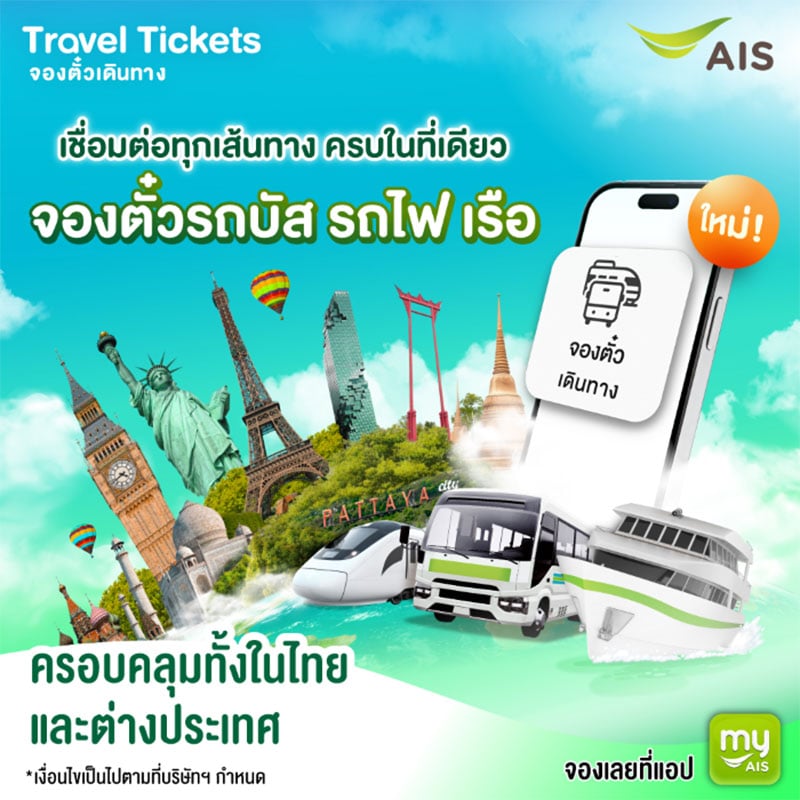 AIS ตอบรับกระแสการท่องเที่ยวช่วงไฮซีซั่นปลายปี เดินหน้ายกระดับแอป myAIS สู่แพลตฟอร์มดิจิทัลด้านการเดินทางและไลฟ์สไตล์อย่างเต็มรูปแบบ ตอกย้ำบทบาท “ศูนย์กลางการเชื่อมต่อทุก Journey การเดินทาง” ครั้งแรก! กับบริการ “จองตั๋วเดินทาง (Travel Tickets)” บนแอป myAIS ให้ลูกค้าสามารถจองตั๋ว รถบัส รถไฟ และเรือ ได้ด้วยตนเองครบทุกขั้นตอน ครอบคลุมเส้นทางทั่วประเทศไทย และมากกว่า 60 ประเทศทั่วโลก จากพันธมิตรด้านการขนส่งกว่า 800 ราย ช่วยให้การวางแผนท่องเที่ยวทั้งในไทยและต่างประเทศเป็นเรื่องง่าย ไม่ต้องสลับหลายแอปหรือหลายแพลตฟอร์ม ลูกค้าสามารถค้นหาเส้นทาง เปรียบเทียบตัวเลือก ชำระเงิน และรับ E-Ticket ได้ทันทีในแอปเดียว สอดรับไลฟ์สไตล์นักเดินทางยุคใหม่ที่ต้องการความสะดวก รวดเร็ว และเชื่อถือได้ นอกจากนี้แอป myAIS ยังมีบริการซื้อแพ็กเกจ International Roaming และ Sim2Fly, สิทธิพิเศษด้านการท่องเที่ยวข้ามประเทศผ่าน WanderJoy, สมัครประกันการเดินทาง เพื่อความอุ่นใจตลอดทริป