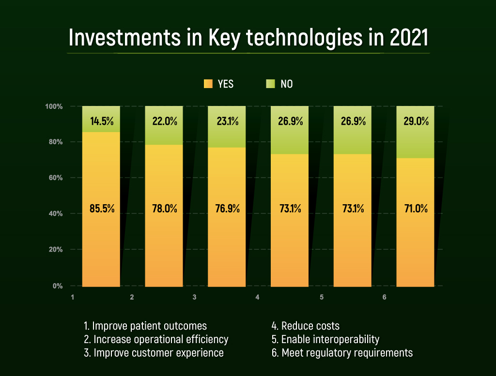 อ้างอิงจากรายงาน Enterprise ICT Investment Trends 2021 Healthcare Sector(1) ที่เผยแพร่มาในเดือนพฤศจิกายน 2021 ได้ระบุถึงผลสำรวจทางด้านเป้าหมายในการลงทุนทางเทคโนโลยีของอุตสาหกรรมการแพทย์และสาธารณสุขทั่วโลกเอาไว้ดังนี้