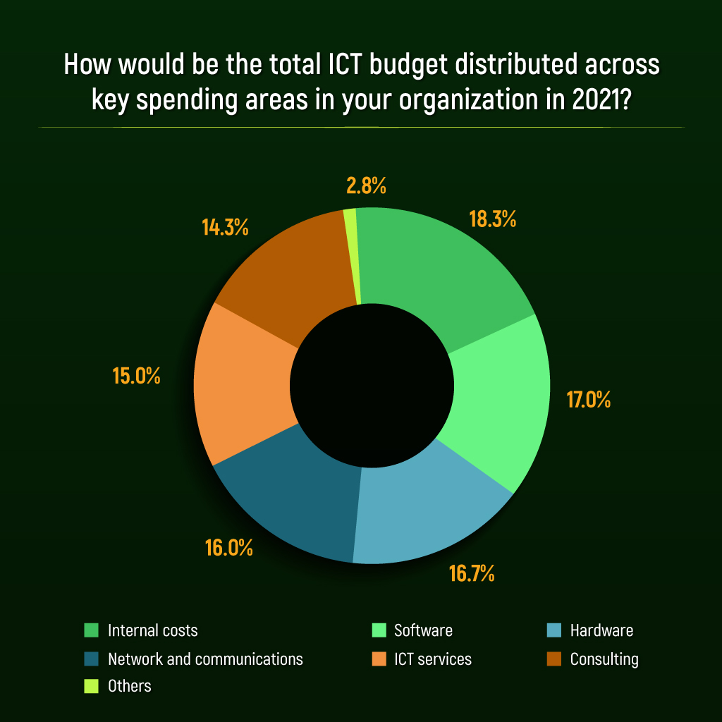 รายงาน Enterprise ICT Investment Trends 2021 Healthcare Sector (1) ระบุถึงสัดส่วนการลงทุนทางด้านเทคโนโลยีในภาพรวมของปี 2021 ทั่วโลกดังนี้