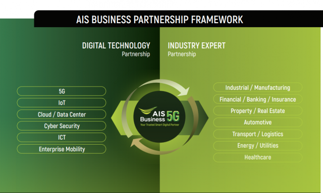 ปัจจัยสำคัญที่ทำให้ AIS Business ก้าวขึ้นมาพร้อมเป็นผู้ช่วยธุรกิจในการทำ Digital Transformation ให้สำเร็จได้นั้น คือ การขยายความร่วมมือ AIS 5G กับพันธมิตรผู้เชี่ยวชาญในอุตสาหกรรมต่าง ๆ อย่างต่อเนื่อง เพื่อสร้าง 5G Ecosystem ที่แข็งแรง ขยายขีดความสามารถในการต่อยอดผลิตภัณฑ์และส่งมอบโซลูชัน AIS 5G แบบครบวงจรสู่การทรานส์ฟอร์มองค์กรให้แก่ลูกค้าทั้งภาครัฐ ภาคธุรกิจ และภาคอุตสาหกรรม
