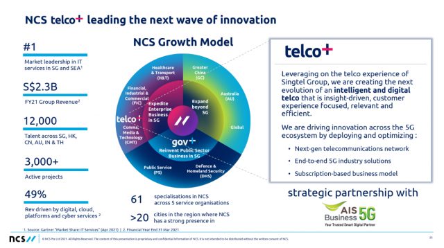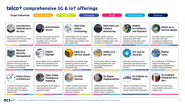 Telco+ เป็นกลุ่มธุรกิจด้านยุทธศาสตร์ของ NCS ซึ่งเป็นบริษัท System Integrator รายใหญ่ภายใต้บริษัท Singtel จากประเทศสิงคโปร์ นับว่าเป็นผู้นำด้านนวัตกรรม IT ในระดับภูมิภาคเอเชียตะวันออกเฉียงใต้ มีความเชี่ยวชาญด้านการออกแบบและการนำเทคโนโลยี 5G และโซลูชันด้าน Video Analytics, Robotics, IoT & Digital Twins, AI/ML, AR/VR มาประยุกต์ใช้ร่วมกับแพลตฟอร์มคลาวด์สำหรับธุรกิจ