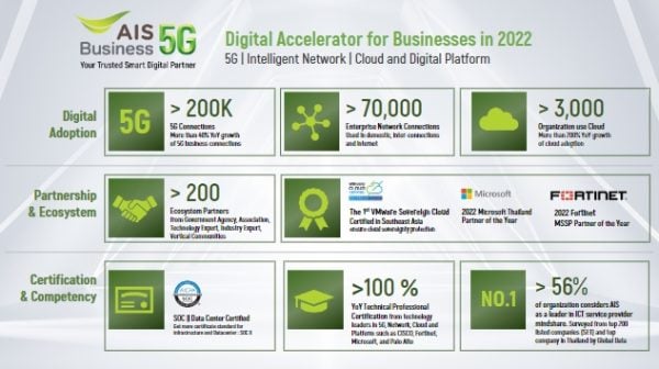 และล่าสุดได้รับการการันตีมาตรฐานจากพาร์เนอร์มากมาย อาทิ การเป็น VMware Sovereign Cloud Certified เป็นรายแรกในประเทศไทย รางวัล 2022 Microsoft Thailand Partner of The Year, 2022 Fortinet MSSP Partner of The Year เป็นต้น จึงทำให้ทาง AIS Business มีความพร้อมที่จะช่วยองค์กรธุรกิจให้สามารถทำดิจิทัลทรานส์ฟอร์เมชันด้วยต้นทุนที่เหมาะสม เดินไปข้างหน้าเป็นเพื่อนร่วมทางที่คอยรับฟังปัญหาและให้คำปรึกษาชี้แนะ อีกทั้งยังมุ่งมั่นวิจัยและพัฒนาค้นหานวัตกรรมใหม่ ๆ ตอบสนองความต้องการของกลุ่มลูกค้ามากขึ้น