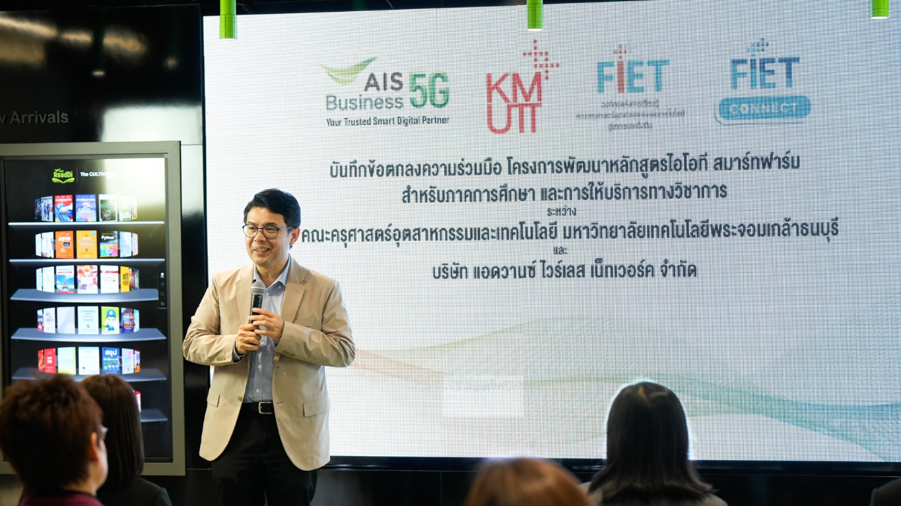 AIS Business ร่วมมือกับ คณะครุศาสตร์อุตสาหกรรมและเทคโนโลยี มหาวิทยาลัยเทคโนโลยีพระจอมเกล้าธนบุรี ลงนามบันทึกข้อตกลงความร่วมมือโครงการพัฒนาหลักสูตรไอโอที สมาร์ทฟาร์ม สำหรับภาคการศึกษา เพื่อร่วมพัฒนาหลักสูตรเทคโนโลยี IoT สนับสนุนให้ความรู้ ความเข้าใจเกี่ยวกับเทคโนโลยี IoT Controller & IoT Sensor สำหรับภาคการศึกษาไทย