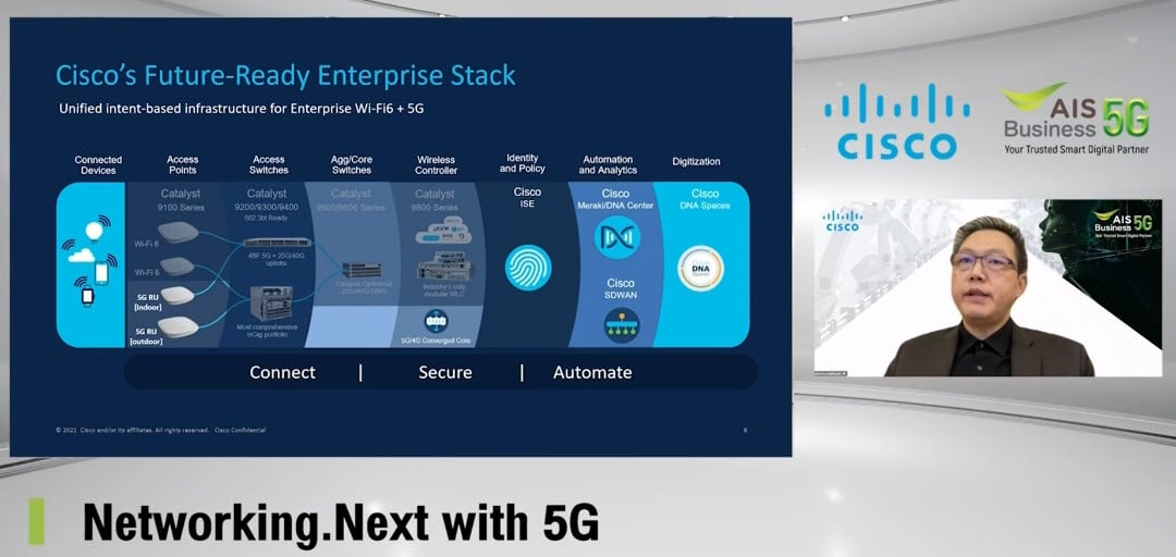 ในการนำเทคโนโลยี 5G ที่มีการออกแบบเฉพาะสำหรับธุรกิจหรือ Private 5G เริ่มมีให้เห็นมากขึ้นเรื่อยๆ แต่ความท้าทายที่ซ่อนอยู่ก็คือการนำ 5G เข้าไปใช้ร่วมกับระบบเดิมที่มีอยู่แล้ว เช่น LAN, WAN และ WLAN คำถามคือภาพของ 5G จะผสานเข้ากับของเดิมอย่างไร ถึงจะสามารถบริหารจัดการ Policy และ Security ร่วมกันได้ ไม่สร้างความซับซ้อนมากขึ้น ในหัวข้อนี้ คุณ Taveewat Chantaraseno, Managing Director จาก Cisco Systems จะมาไขปัญหาข้อกังวลใจเหล่านี้