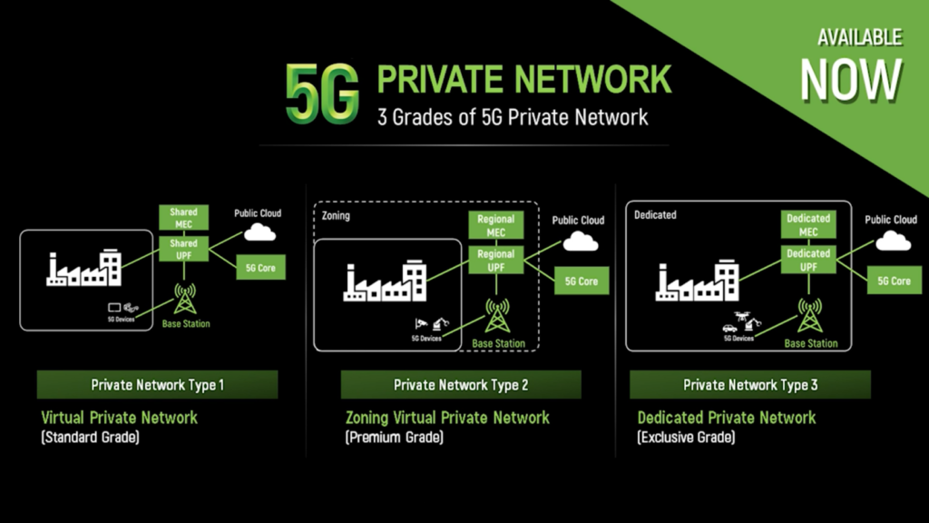 • Exclusive Grade คือแบบที่จะสร้างเครือข่าย MEC และ UPF ให้ใช้งานแบบเฉพาะ ซึ่งจะเหมาะกับงานที่ต้องการ Low Latency และมีความเป็นส่วนตัว (Data Privacy) สูงมาก ๆ เช่น การทำระบบอัตโนมัติ (Automation) ในโรงงานอุตสาหกรรม หรือการผ่าตัดจากระยะทางไกล