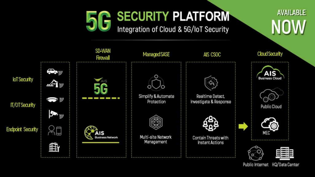 • 5G Security Platform โดย AIS 5G Business ได้ร่วมมือกับพาร์ตเนอร์มากมายเพื่อในการสร้างโซลูชันความปลอดภัยในแต่ละระดับ ไม่ว่าจะเป็น IoT Security, IT/OT Security หรือ Endpoint Security ที่จะผสมผสานกับโซลูชันอย่าง SD-WAN Firewall, Managed SASE และบริการ CSOC เพื่อทำให้มั่นใจได้ว่าผู้ใช้งานหรือเชื่อมต่อกับแพลตฟอร์มจะมีความปลอดภัยจากการถูกคุกคามทางไซเบอร์ได้