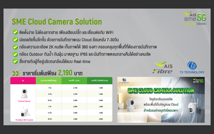 นอกจากนี้ยังมีแพคเกจ “SME Cloud Camera Solution” โซลูชั่นกล้องวงจรปิดพร้อมพื้นที่เก็บข้อมูลบน Cloud ที่ถูกออกแบบมาเพื่อองค์กรธุรกิจโดยเฉพาะ สามารถปรับแต่งได้ตามความต้องการในราคาเริ่มต้นที่ 2,190 บาท