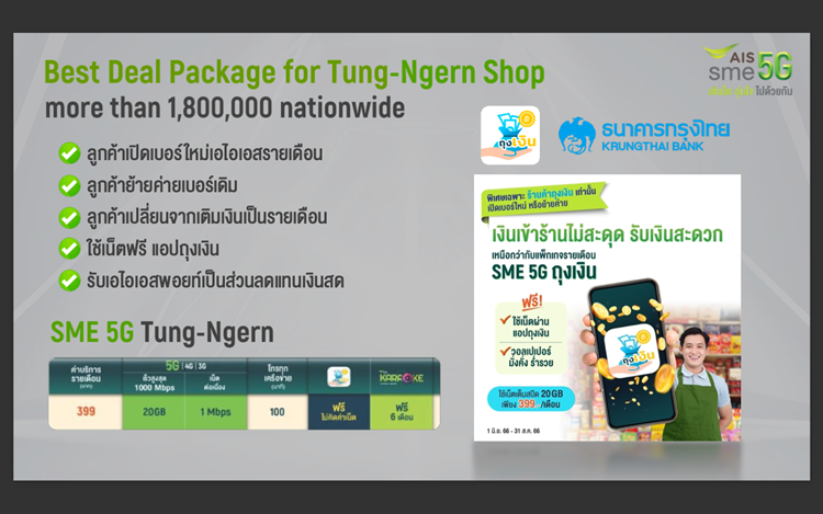 สิ่งที่ AIS จะให้กับ SME ไทย จะเริ่มตั้งแต่กลุ่ม Commerce โดยมีการออกแพคเกจ “SME 5G ถุงเงิน” สำหรับ “ร้านค้าถุงเงิน” ที่อยู่ในระบบกว่า 1.8 ล้านรายโดยเฉพาะ ทำให้ทุกธุรกรรมหรือการใช้งานแอปพลิเคชั่นถุงเงินทุกรูปแบบไม่เสียค่าอินเทอร์เน็ต มีวอลเปเปอร์มงคล อินเทอร์เน็ต 20GB คิดค่าบริการรายเดือน 399 บาท เสริมธุรกิจให้ซื้อง่าย-ขายคล่อง และต้นทุนต่ำ