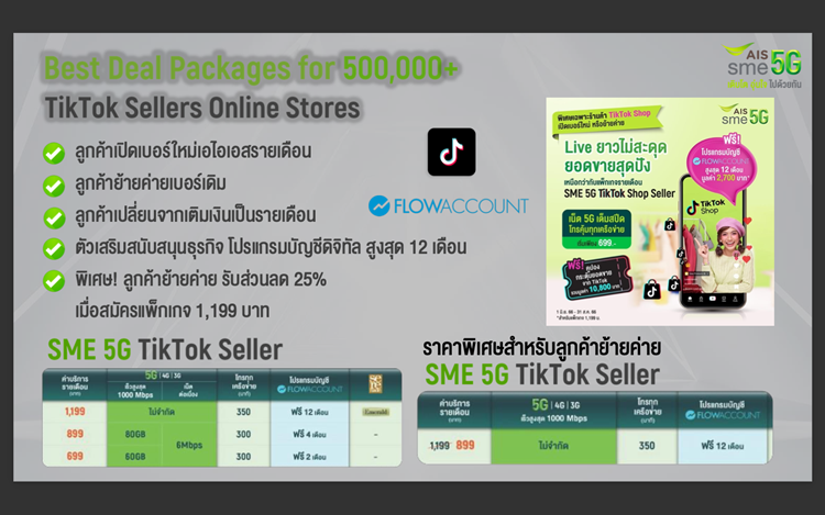 สำหรับพ่อค้า-แม่ค้าออนไลน์บนแพลตฟอร์ม TikTok มีแพคเกจ “SME 5G TikTok Seller” ที่ให้การใช้งาน TikTok ไม่มีค่าใช้จ่ายอินเทอร์เน็ตเพิ่มเติม และยังสามารถใช้บริการโปรแกรมบัญชีจาก FLOWACCOUNT ได้ฟรีอีก 12 เดือน ในราคา 1,199 บาท