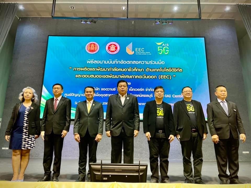 AIS 5G จับมือ วิทยาลัยเทคนิค ชลบุรี ลงนามบันทึกข้อตกลงความร่วมมือ การผลิตและพัฒนากำลังคนอาชีวศึกษา ด้านเทคโนโลยีดิจิทัล 5G เพื่อตอบสนองแรงงานในเขตพัฒนาพิเศษภาคตะวันออก (EEC) ร่วมกับ ศูนย์ปัญญาประดิษฐ์เพื่ออุตสาหกรรม วิทยาลัยเทคนิคชลบุรี (CTC IAI Center)