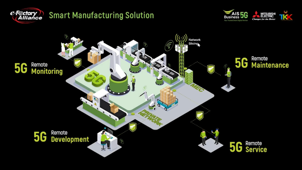 ด้วยโซลูชัน e-F@ctory จากทาง Mitsubishi Electric กับผู้เชี่ยวชาญในภาคอุตสาหกรรมการผลิตอย่าง TKK และผู้ให้บริการ 5G ที่แข็งแกร่งที่สุดของไทยอย่าง AIS Business จึงทำให้เกิดเป็นโซลูชัน Smart Manufacturing ที่สามารถยกระดับระบบอุตสาหกรรมอัตโนมัติ (Factory Automation : FA) ในการเชื่อมต่อข้อมูลจากอุปกรณ์ฝั่ง OT เข้ากับ IT ไปอีกขั้นผ่านเครือข่าย 5G ที่มีความรวดเร็วและมีศักยภาพมากยิ่งขึ้น ด้วยความร่วมมือนี้จึงทำให้เกิดโซลูชันการทำงานจากระยะไกลสำหรับภาคอุตสาหกรรมการผลิตในรูปแบบต่าง ๆ ที่สามารถใช้งานได้จริงแล้ว ดังนี้