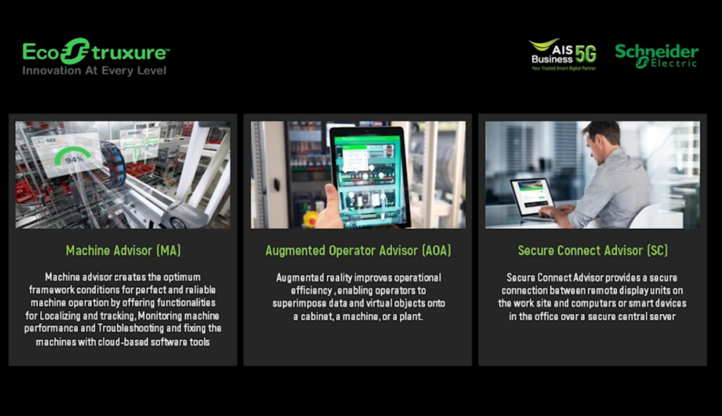 ทาง Schneider Electric คือหนึ่งในผู้เชี่ยวชาญในการบริหารจัดการพลังงานให้เกิดประสิทธิภาพสูงสุดที่สามารถตรวจสอบติดตามพลังงานได้ทุกรูปแบบที่ไม่ใช่แค่พลังงานไฟฟ้าเท่านั้น และด้วยความร่วมมือกับทาง AIS Business จึงทำให้เกิดการใช้งานระบบ EcoStruxure ร่วมกับเครือข่าย 5G ที่สนับสนุนให้โซลูชันต่าง ๆ สามารถตรวจสอบและควบคุมพลังงานได้ผ่านระบบ IoT ผ่านเครือข่ายไร้สายได้อย่างมีประสิทธิภาพสูงขึ้น ไม่ว่าจะเป็น Building Advisor, Workplace Advisor หรือ Resource Advisor นั้นสามารถดำเนินการได้อย่างรวดเร็ว