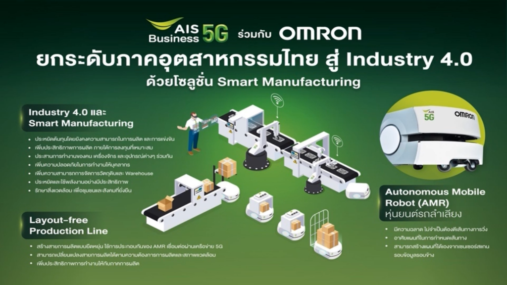 ตัวอย่าง Use Case ที่เริ่มใช้งานแล้วจริงแล้วจากความร่วมมือกันระหว่าง OMRON กับทาง AIS Business นั้นคือระบบ Layout-free Production Line ที่สายการผลิตภายในโรงงานจะไม่ถูกจำกัดตาม Layout ที่วางไว้อีกต่อไป ด้วยการใช้หุ่นยนต์ Autonomous Mobile Robot (AMR) ร่วมกับโครงข่าย 5G จึงทำให้หุ่นยนต์ AMR สามารถกำหนดปรับเปลี่ยนเส้นทางการวิ่งได้อย่างยืดหยุ่น โดยรูปแบบหนึ่งที่นำไปปรับใช้แล้วคือการลำเลียงส่งสิ่งของภายในโรงงานได้อัตโนมัติโดยที่ปราศจากมนุษย์เข้าไปแทรกแซง อีกทั้งยังสามารถตรวจสอบติดตามย้อนหลังได้หากเกิดปัญหาใด ๆ ขึ้นเนื่องจากจะมีการเก็บข้อมูลจากฝั่ง Operational Technology (OT) มาเก็บไว้ที่ฝั่ง Information Technology (IT) อยู่ตลอดนั่นเอง