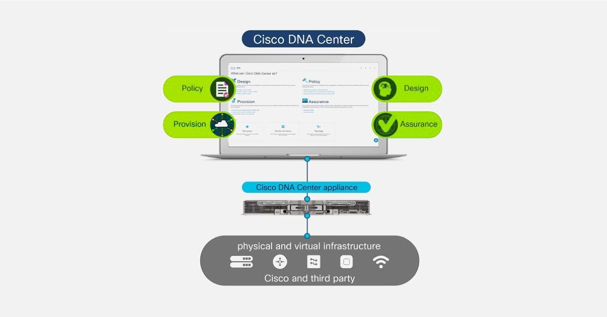Cisco DNA Center คือระบบบริหารจัดการเครือข่ายล่าสุดจาก Cisco ที่ครอบคลุมการจัดการทั้งในส่วนของ NetOps, SecOps, DevOps และ Internet of Things (IoT) ได้จากศูนย์กลาง โดยมีการผสานใช้งาน AI และ Machine Learning เพื่อช่วยให้การบริหารจัดการระบบ Network Infrastructure สำคัญขององค์กรเป็นไปได้อย่างอัตโนมัติและชาญฉลาด