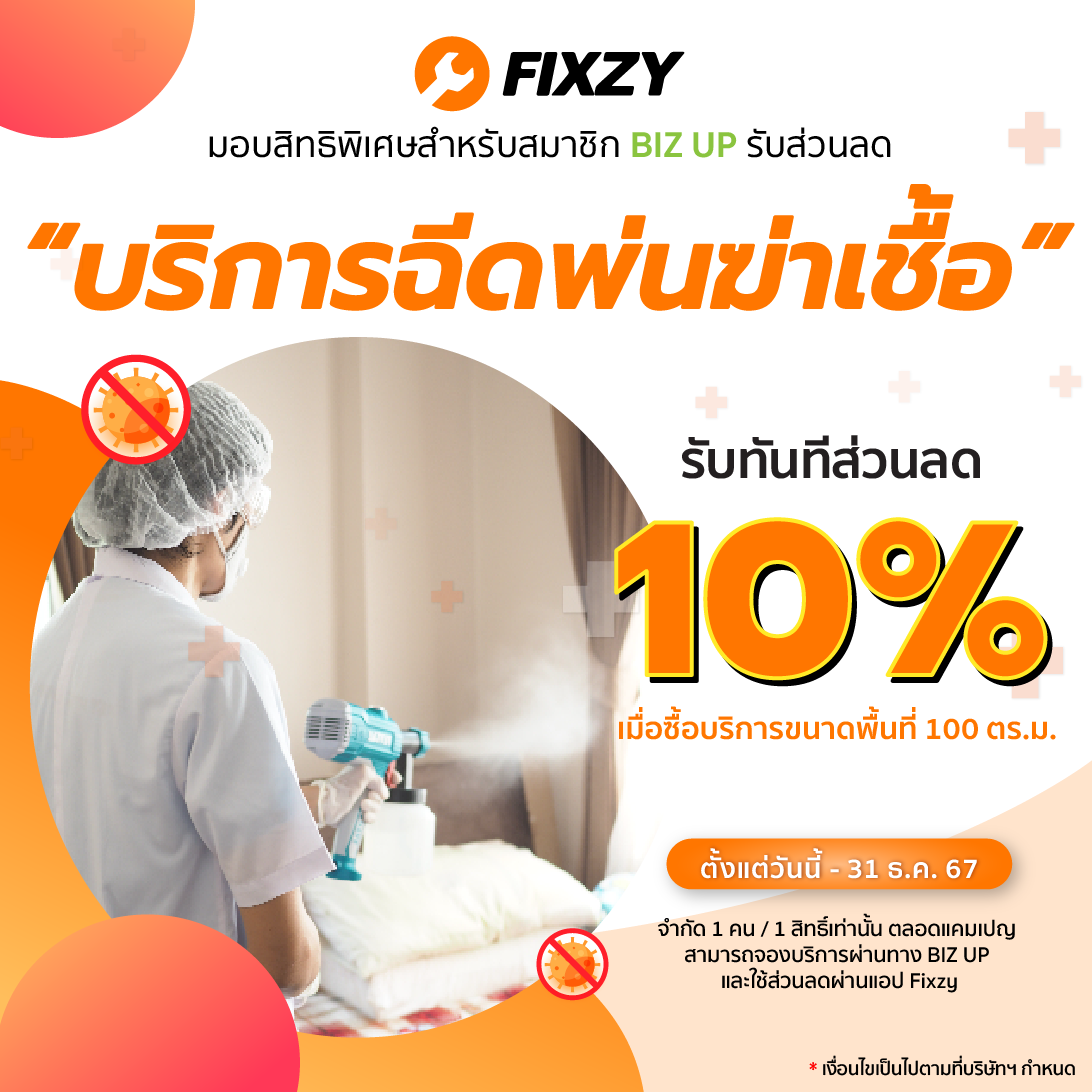 รับส่วนลด 10% เมื่อฉีดพ่นน้ำยาฆ่าเชื้อ ขนาดพี้นที่ 100 ตร.ม. เฉพาะพื้นที่กรุงเทพมหานครกับ Fixzy