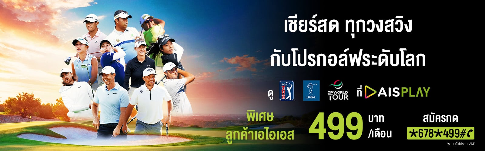 " คุณได้เริ่มใช้งานแพ็กเกจ Golf รายเดือน ฟรี 3 เดือนแรก หลังจากนั้น ค่าบริการ 499 บ./เดือน (ไม่รวม VAT) รับชมถ่ายทอดสดการแข่งขันกอล์ฟระดับโลก PGA TOUR ผ่าน AIS PLAY เริ่ม คลิก "