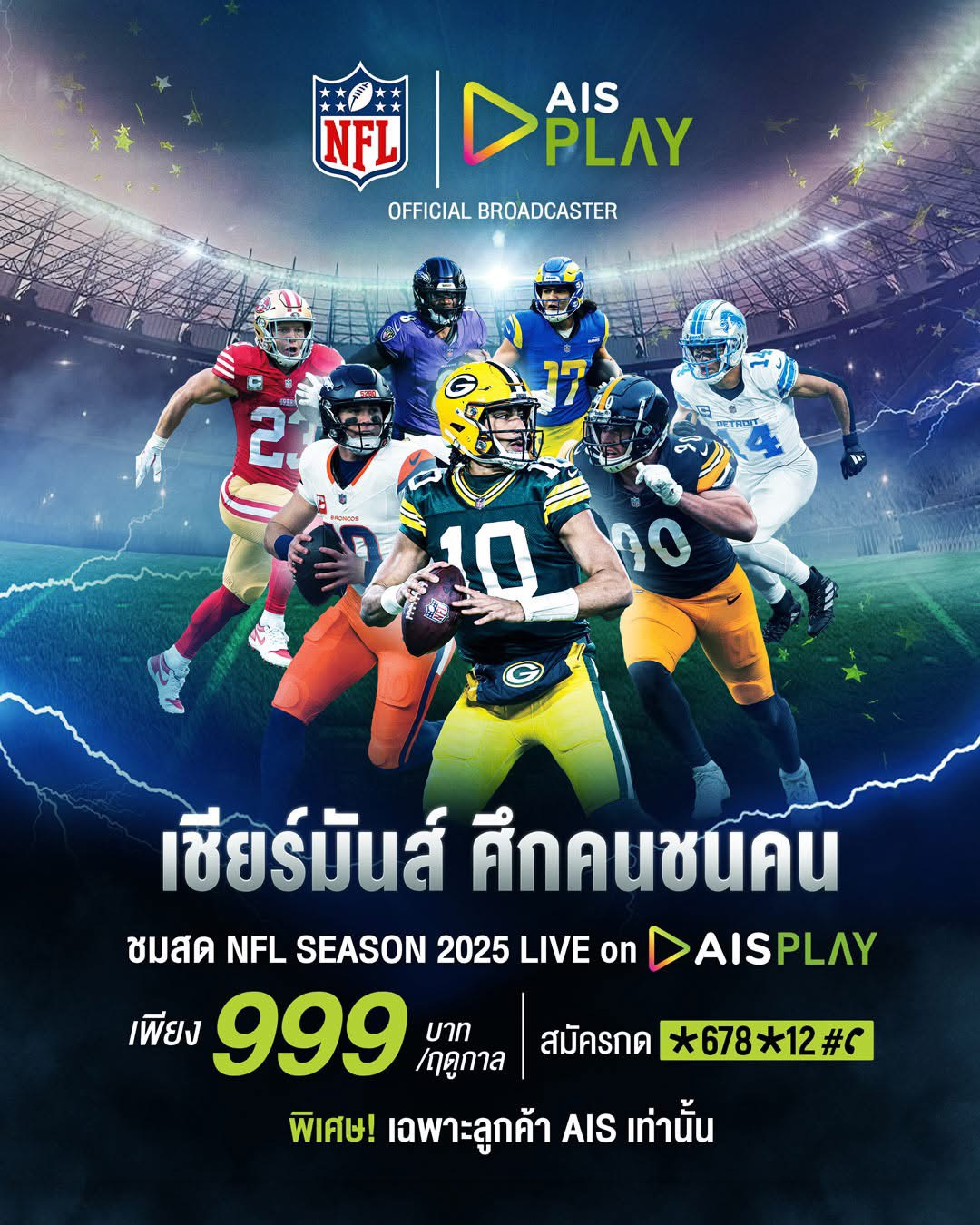 ด้านสาวกศึก “คนชนคน” หรืออเมริกันฟุตบอล NFL ก็สามารถรับชมได้ด้วยการซื้อแพ็กเกจแบบ Season pass ค่าบริการเพียง 999 บาทต่อฤดูกาล ที่จะทำให้สามารถรับชมได้ทุกนัดจนถึงซุปเปอร์โบวล์ ครั้งที่ 60 ในเดือนกุมภาพันธ์ 2569