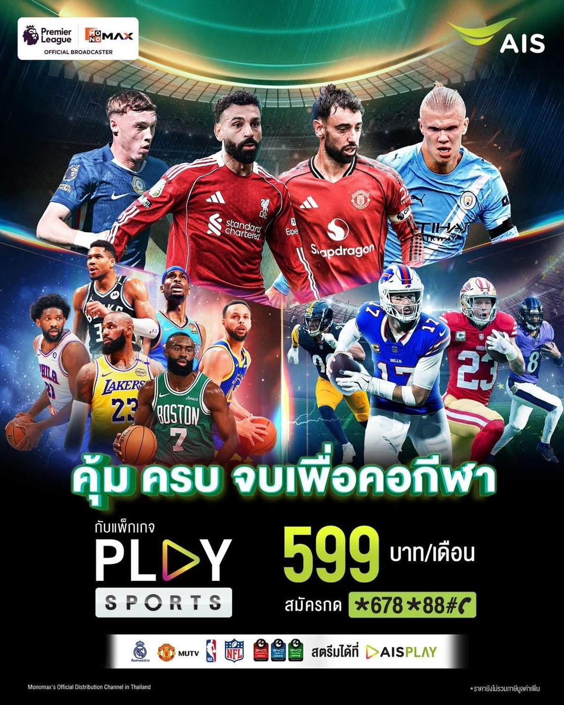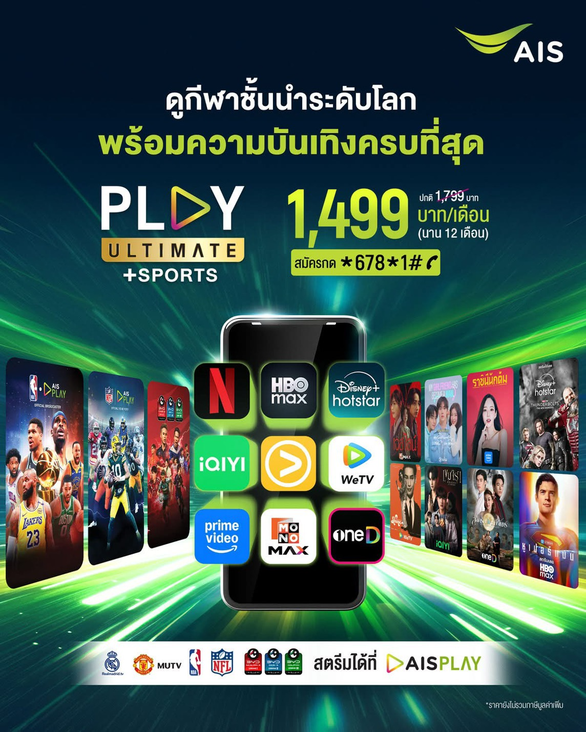 แต่ถ้าคุณไม่เพียงดูกีฬา แต่ยังชื่นชอบความบันเทิงจากสตรีมมิงแพลตฟอร์มชั้นนำ ต้องแพ็กเกจนี้เลย PLAY ULTIMATE+SPORTS รายเดือน ราคา 1,499 บาท (ไม่รวม VAT) ที่นอกเหนือจากคอนเทนต์กีฬาเต็มอิ่มทั้ง พรีเมียร์ลีก อังกฤษ, อเมริกันฟุตบอล NFL รวมถึงบาสเกตบอล NBA แล้ว ยังมี Netflix, HBO Max, Disney+ , Prime Video, iQIYI, Viu, WeTV, AIS KARAOKE, Monomax และ one เรียกได้ว่าจ่ายที่เดียว ดูได้ครบทุกอย่างทั้งกีฬาและความบันเทิง