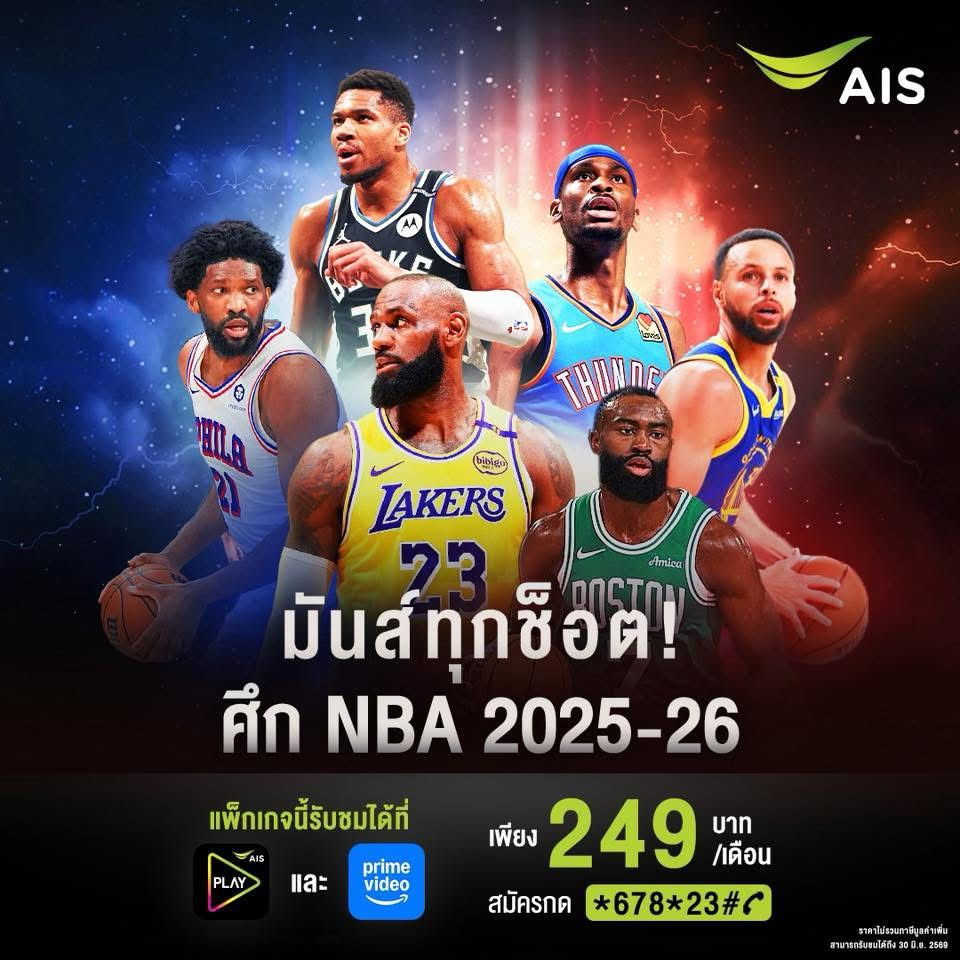 สำหรับคอกีฬายัดห่วงที่ชื่นชอบในบาสเกตบอล NBA สามารถรับชมได้แบบจุใจ ในราคาสุดคุ้มเพียงเดือนละ 249 บาท ชมมากกว่า 290 นัด โดยสามารถรับชมครบทั้งฤดูกาลปกติ รอบเพลย์ออฟ และอีเวนต์พิเศษอย่าง ออลสตาร์เกม ทาง AIS PLAY และ แพ็กเกจนี้ยังมาคู่กับ Prime Video ที่สามารถรับชมความบันเทิงระดับโลก พร้อมกับเกม NBA สุดเอ็กซ์คลูซีฟใน Prime Video ที่ครอบคลุมตั้งแต่ Regular Season จนถึง Finals