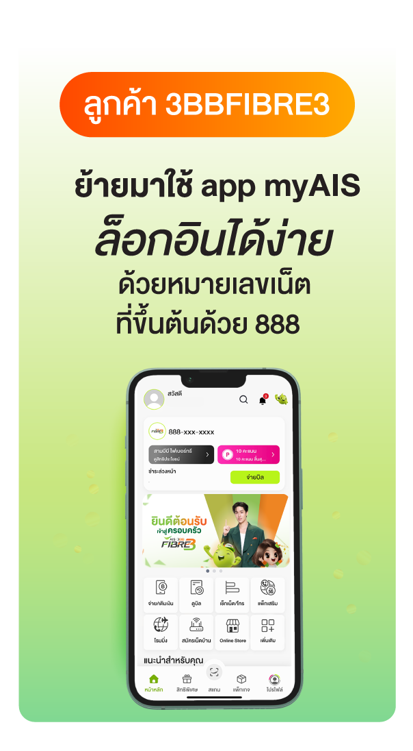 ลูกค้า สามบีบีไฟเบอร์ทรี อัปเกรดชีวิตให้ดีขึ้นได้อีกขั้นเพียงย้ายมาที่แอป myAIS แล้วล็อกอินด้วยหมายเลขเน็ตบ้านที่ขึ้นต้นด้วย 888