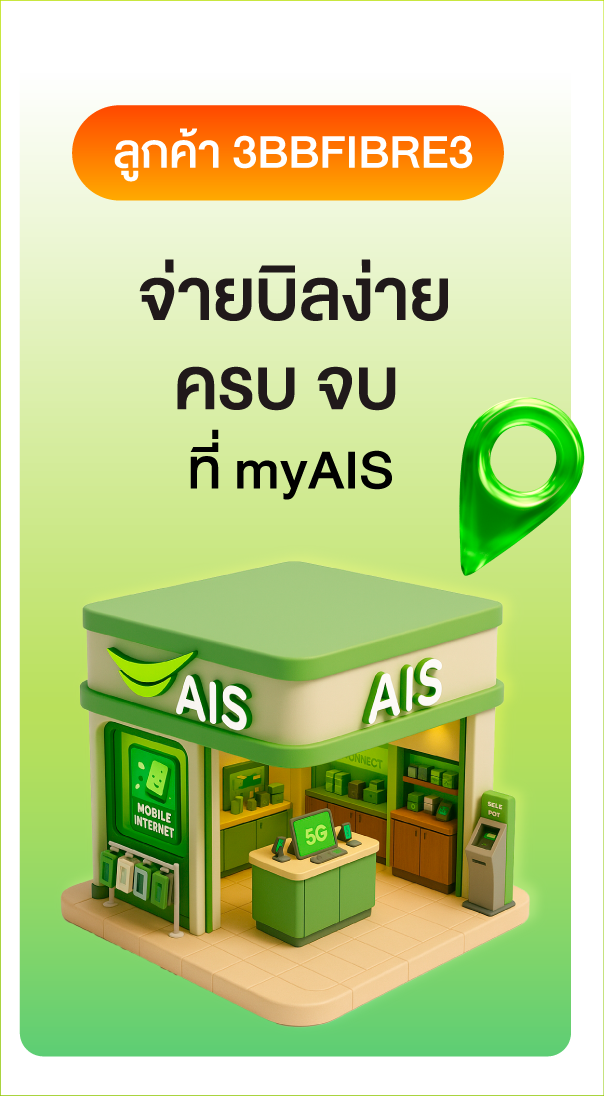 ชำระค่าบริการง่ายขึ้นได้อีกขั้น ทั้งเน็ตบ้าน สามบีบีไฟเบอร์ทรี และ เอไอเอส ไฟเบอร์ทรี และมือถือ เอไอเอสแบบรายเดือน และแบบเติมเงิน