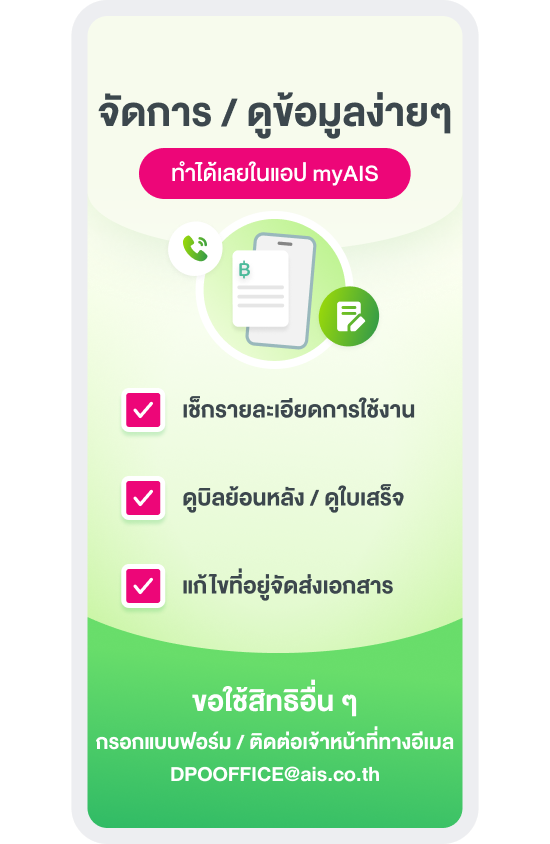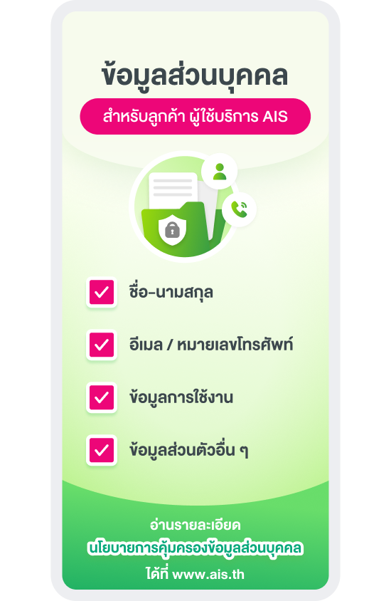 ซึ่ง AIS ให้ความสำคัญต่อการคุ้มครอง และรักษาความมั่นคงปลอดภัยของข้อมูลส่วนบุคคลเป็นอย่างยิ่ง จึงได้จัดทำประกาศการคุ้มครองข้อมูลส่วนบุคคล เพื่อเป็นการแจ้งให้ทราบถึงวิธีการที่บริษัทปฏิบัติต่อข้อมูลส่วนบุคคลเช่น การเก็บรวบรวม การใช้ การเปิดเผย รวมถึงการขอใช้สิทธิต่างๆ เป็นต้น