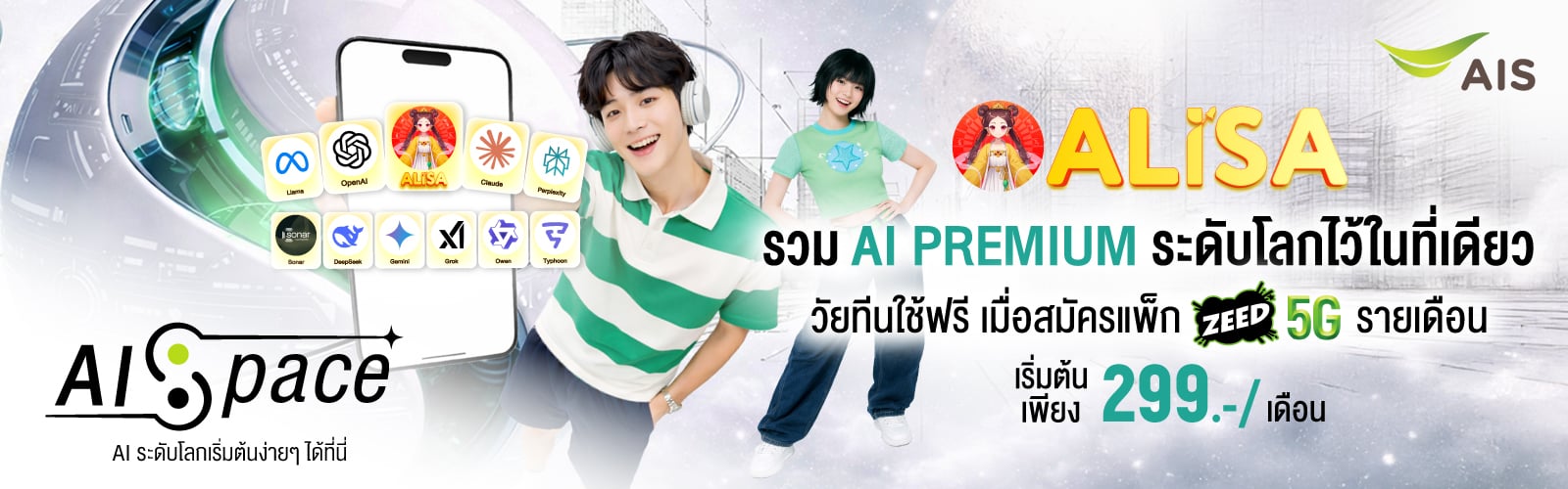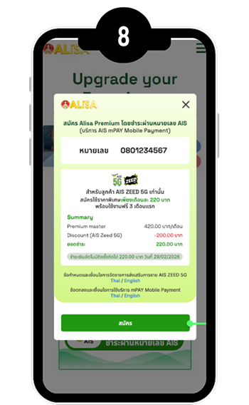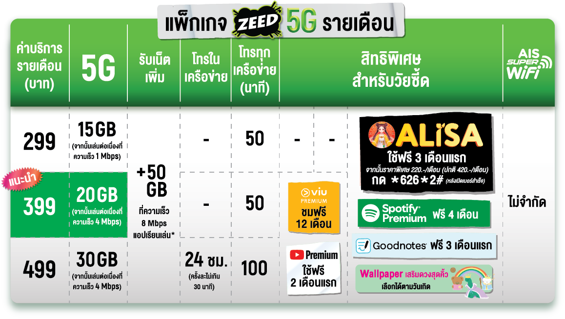 เงื่อนไขการจัดรายการส่งเสริมการขาย เปิดเบอร์ใหม่หรือย้ายค่าย ZEED 5G พร้อมสมัครแพ็กเกจรายเดือน 299 บาทขึ้นไป สามารถสมัครใช้งาน Alisa Premium รับสิทธิ์ใช้งานฟรี 3 เดือนแรก จากนั้นชำระค่าบริการเพียงเดือนละ 220 บาท (ปกติราคาเดือนละ 420 บาท) ราคารวม VAT เป็นระยะเวลา 12 เดือน เมื่อสมัครผ่าน USSD *626*2# โทรออก ภายใน 30 วันนับจากวันที่ได้รับ SMS แจ้งสิทธิ์สมัครใช้งาน Alisa Premium และชำระเงินผ่านบริการ AIS mPAY Mobile Payment