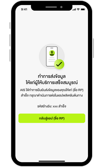 ผู้รับบริการที่ประสงค์ลงทะเบียนและใช้ “ยืนยันตัวตนโดย AIS” รับทราบว่าการตกลงยอมรับข้อตกลง “ยืนยันตัวตนโดย AIS” ฉบับนี้มีผลผูกพันผู้รับบริการตามหลักเกณฑ์และเงื่อนไขที่กำหนดในข้อตกลง “ยืนยันตัวตนโดย AIS” ฉบับนี้ทุกประการ