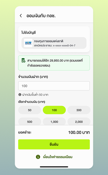 8. ฝากเงินเพื่อเปิดบัญชีกับกอช. ใส่จำนวนเงินที่ต้องการออม เริ่มต้น 50 บาท สูงสุดไม่เกิน 30,000 บาท/ปี จากนั้นกด “ยืนยัน”