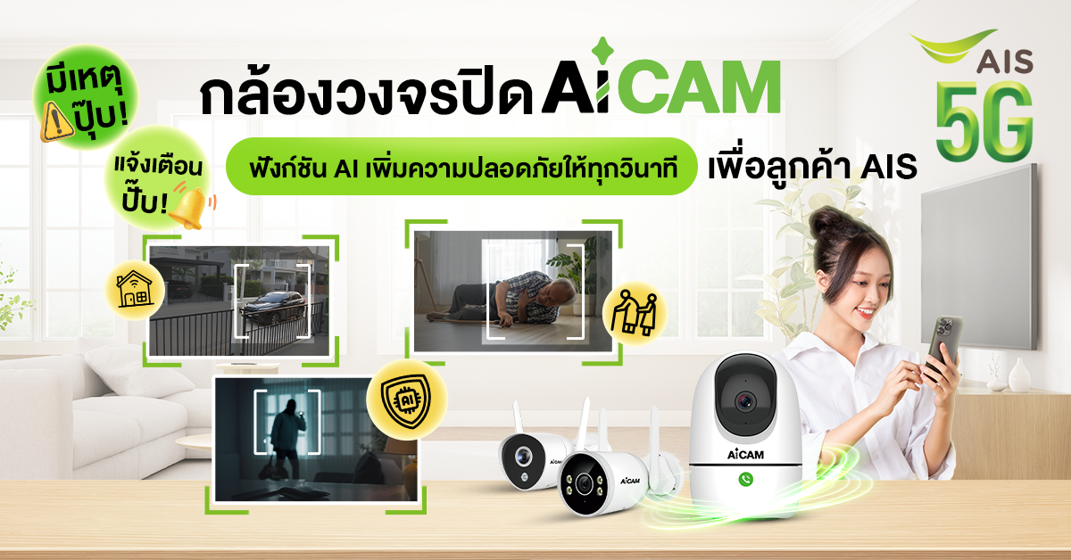 AiCAM กล้องวงจรปิด AIS อัจฉริยะ พร้อม AI แจ้งเตือน Real-time ดูผ่านมือถือได้ คมชัดทั้งกลางวัน-กลางคืน ช่วยดูแลผู้สูงอายุ เด็ก และสัตว์เลี้ยง