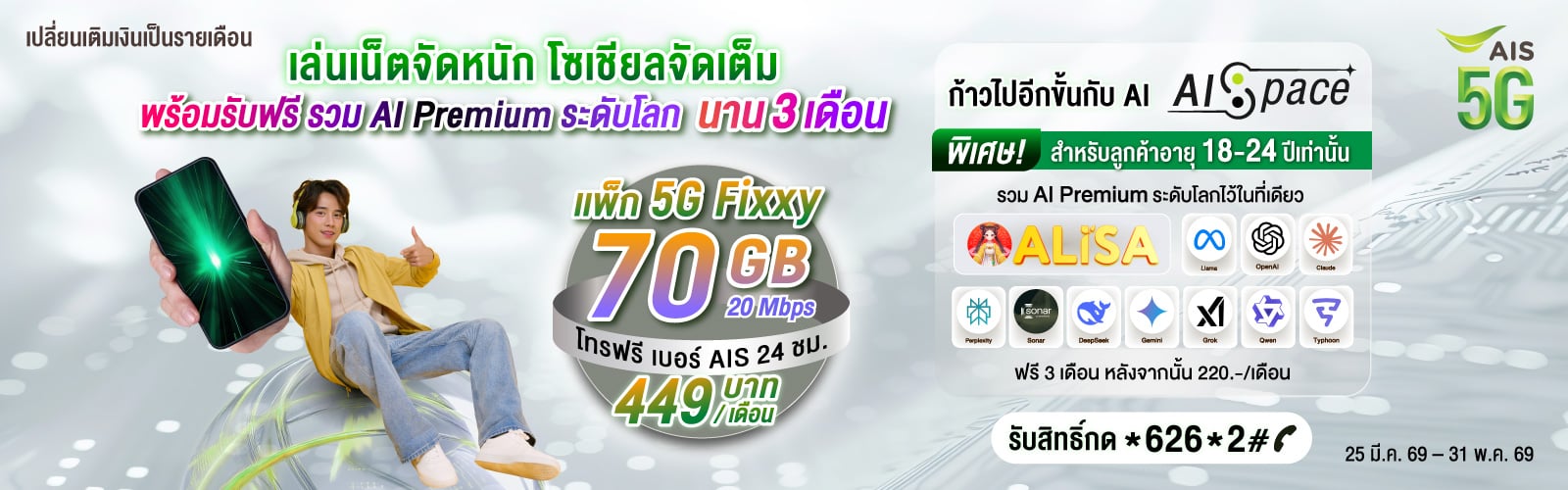 เลือกสมัครรับข้อเสนอ แพ็กเกจ 5G ราคาสุดคุ้ม เน็ตจุใจ โทรฟรีในเครือข่าย AIS