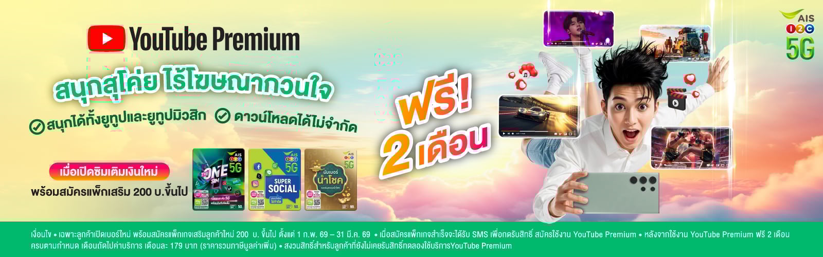 - ลูกค้าใช้งานเครื่อง iPad หรือแท็บเล็ตอื่นๆ ต้องเปลี่ยนซิมมาใส่เครื่องสมาร์ทโฟนก่อน แล้วกด *656*89# โทรออก เพื่อรับสิทธิ์ฟรี YouTube Premium Lite