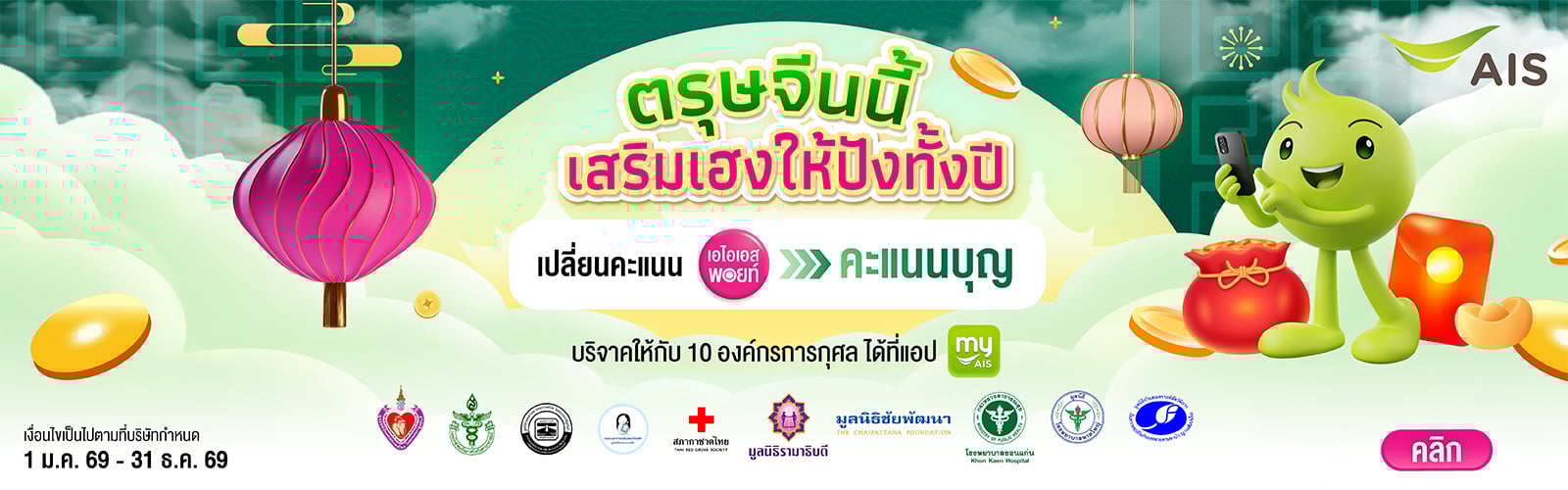 - เพื่อให้ลูกค้า AIS ได้รับสิทธิประโยชน์จากโครงการเอไอเอส พอยท์ (AIS Points) ที่บริษัทมอบให้อย่างเต็มที่ โปรดตรวจสอบวันหมดอายุของคะแนนสะสมเอไอเอส พอยท์ทางแอปพลิเคชัน myAIS และใช้สิทธิตามโครงการเอไอเอส พอยท์ (AIS Points) ก่อนวันที่คะแนนสะสมจะหมดอายุลง