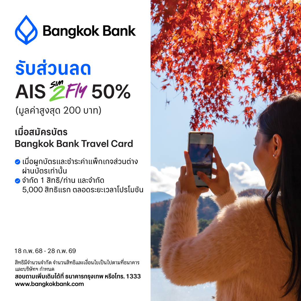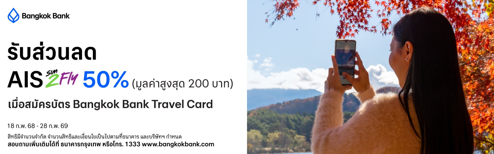 รับส่วนลด AIS SIM2Fly 50% (มูลค่าสูงสุด 200.-)เมื่อสมัครบัตร