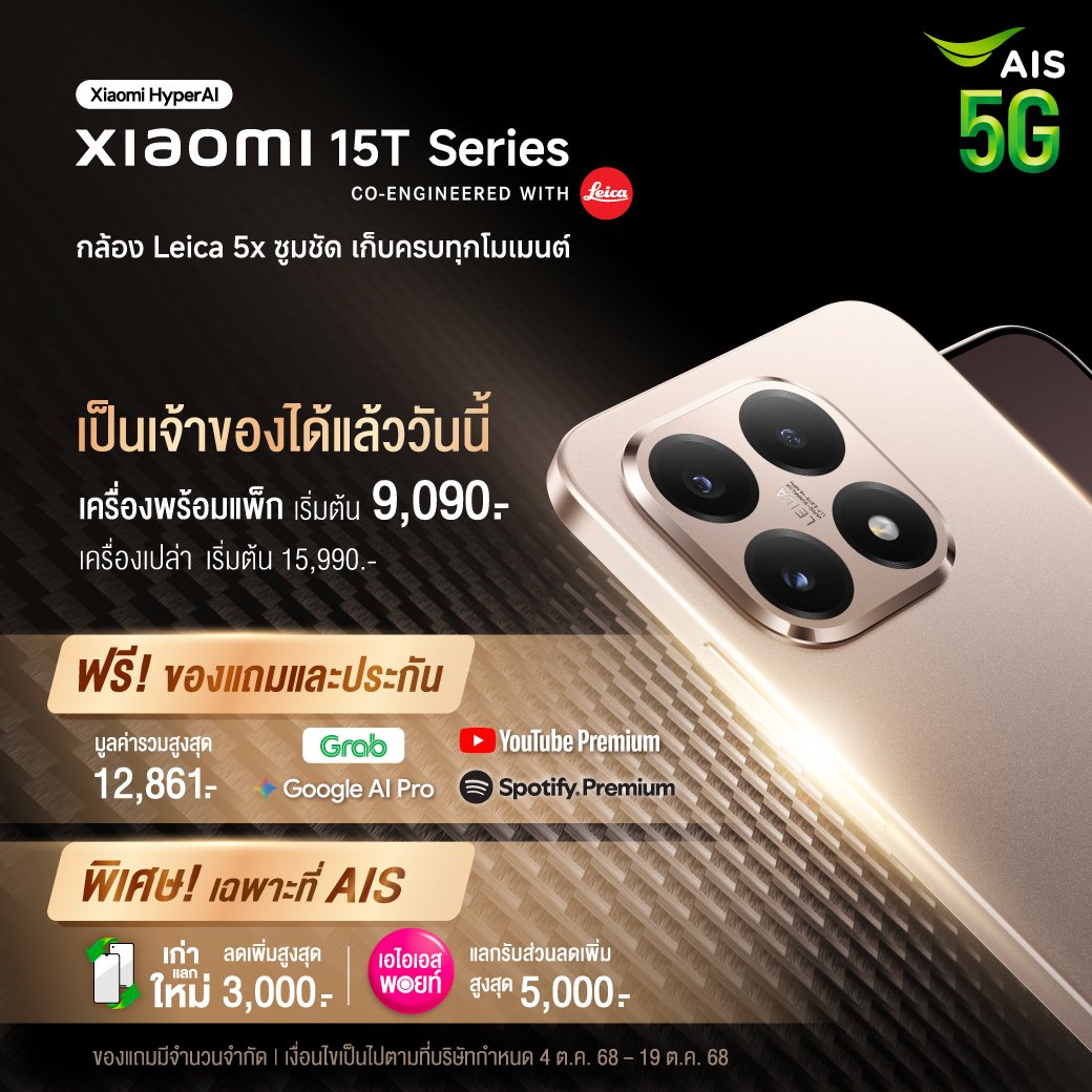 รับฟรี Redmi Watch 5 Active และ Xiaomi Power bank 10000 mAh เมื่อสั่งซื้อรุ่น Xioami 15T (*ของแถมจำนวนจำกัด)