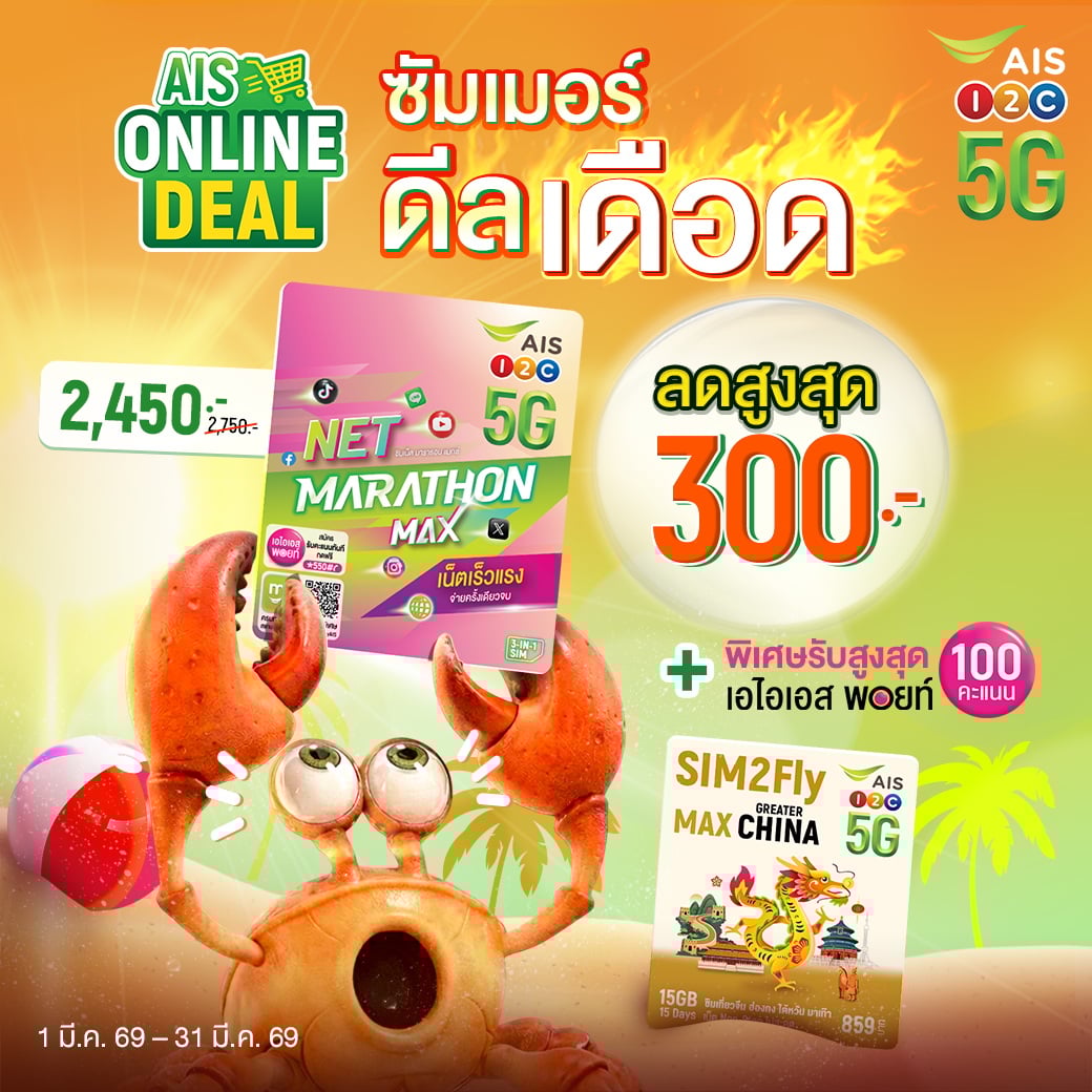 สั่งซื้อซิม AIS ออนไลน์ราคาพิเศษ ทั้งซิมเน็ตรายปี ซิม Marahtron และ SIM2Fly รับส่วนลดสูงสุด 300 บาท พร้อมคะแนน AIS Points ส่งฟรีถึงบ้าน