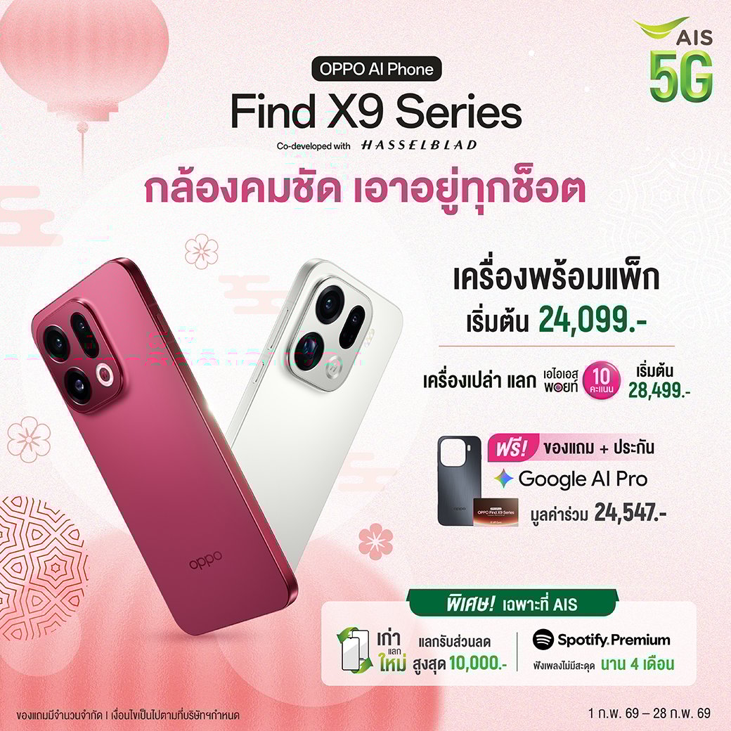 ซื้อ OPPO Find X9 Series กล้อง Hasselblad ที่ AIS เริ่มต้นเพียง 24,099.- ฟรี! ของแถมและ Google AI Pro มูลค่ากว่า 2 หมื่นบาท พร้อมส่วนลดเก่าแลกใหม่สูงสุด 10,000.-