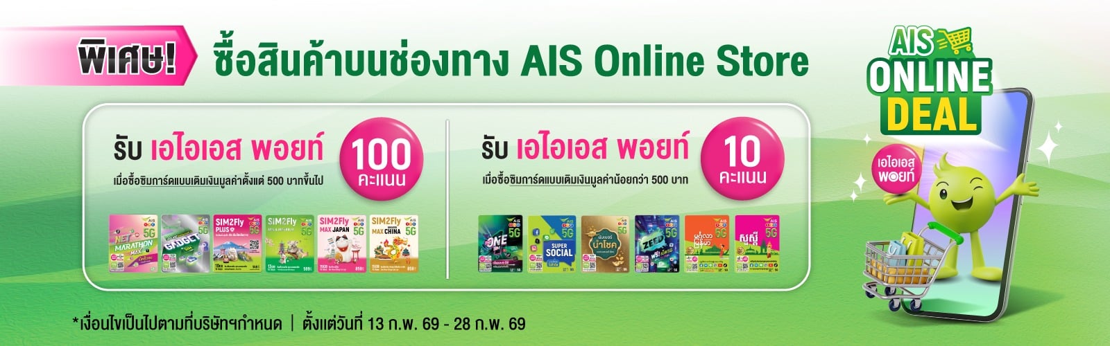 สิทธิ์การให้คะแนนเอไอเอส พอยท์ สำหรับแคมเปญ “AIS Online Deal อั่งเปา ลดปัง” ตั้งแต่วันที่ 13 ก.พ 69 – 28 ก.พ. 69
