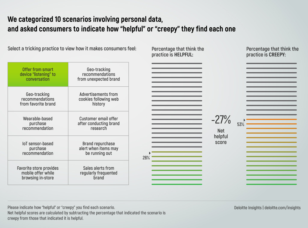 ประเด็นนี้ Deloitte ได้มีการสำรวจความคิดเห็นของผู้บริโภคราว 11,500 คน ว่ารู้สึกอย่างไรเมื่อภาคธุรกิจต่าง ๆ มีการเก็บข้อมูลของพวกเขาและนำไปใช้เพื่อนำเสนอประสบการณ์ใหม่ ๆ [1] โดยการสำรวจได้มีการแบ่งความรู้สึกออกเป็น 3 ทางตั้งแต่รู้สึกในเชิงบวกไปจนถึงความรู้สึกในเชิงลบ คือ