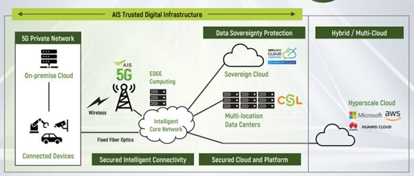 จากภาพไดอะแกรมเบื้องต้นนั้น AIS Business มีโซลูชันที่ครอบคลุมโดยองค์กรธุรกิจสามารถดำเนินการและใช้งานโครงสร้างดิจิทัลนี้ตั้งแต่การสร้างระบบเครือข่ายแบบ 5G ที่เป็นส่วนตัว (5G Private Network) เชื่อมโยงกับดีไวซ์และอุปกรณ์ IoT ในองค์กรของตน