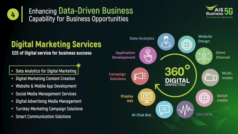 นอกจาก Intelligent Data Analytics ที่เข้ามาช่วยวางแผนการทำธุรกิจของลูกค้าแล้ว โซลูชันทางการตลาดดิจิทัลแบบครบ 360 องศา ของ AIS Business ยังเป็นอีกเครื่องมือสำคัญในการสื่อสารทางการตลาดที่ช่วยสร้างความตระหนักรู้ เพิ่มโอกาสการขาย เปลี่ยนข้อมูลลูกค้า (Leads) ให้กลายมาเป็นลูกค้าจริง และสร้างลูกค้าที่สนับสนุนและภักดีต่อแบรนด์