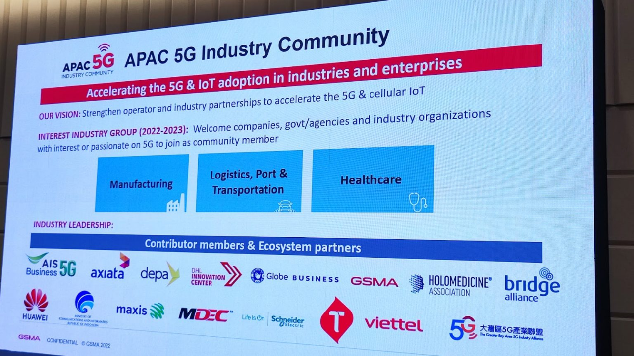 กลุ่มอุตสาหกรรมเทคโนโลยี 5G ภูมิภาคเอเชียแปซิฟิก หรือ “APAC 5G Industry Community” นั้นได้เกิดขึ้นมาตั้งแต่ช่วงตุลาคม 2021 ที่ผ่านมาโดย GSMA เป็นผู้ก่อตั้ง และเริ่มต้นบุกเบิกร่วมกับสมาชิกร่วมก่อตั้ง 12 องค์กรชั้นนำที่มาอยู่ภายในระบบนิเวศน์ 5G ระดับภูมิภาค อันได้แก่ AIS, Axiata, depa, DHL, Globe, Huawei, Kominfo, Maxis, MDEC, Schneider Electric, Telkomsel และ Viettel