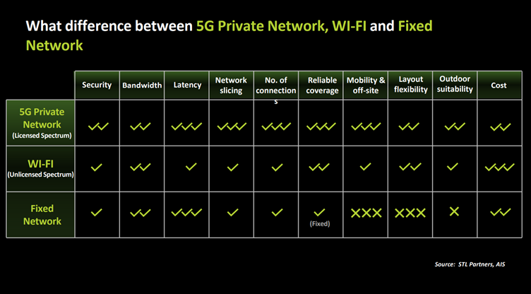 จากตารางดังกล่าวจะเห็นได้ว่าข้อดีของ 5G Private Network เมื่อเปรียบเทียบกับระบบเครือข่ายแบบดั้งเดิม จะมีดังต่อไปนี้
