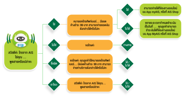 เพื่อให้เห็นภาพการใช้งานจริงมากขึ้น ขอยกตัวอย่างบทสนทนาของ AI Voice Bot ที่โทรแจ้งเตือนลูกค้าเรื่องยอดค้างชำระจ่าย โดยมีขั้นตอนต่าง ๆ อิงตาม Dialog Flow ดังนี้