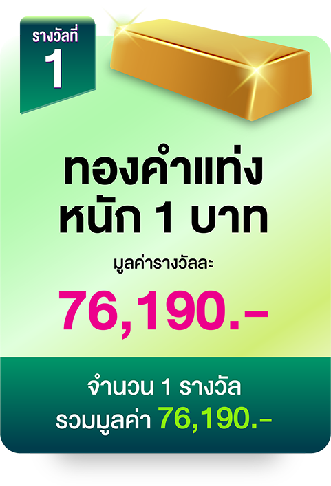 รางวัลที่ 1 : ทองคำแท่ง หนัก 1 บาท จำนวน 1 รางวัล รางวัลละ 76,190 บาท รวมมูลค่า 76,190 บาท