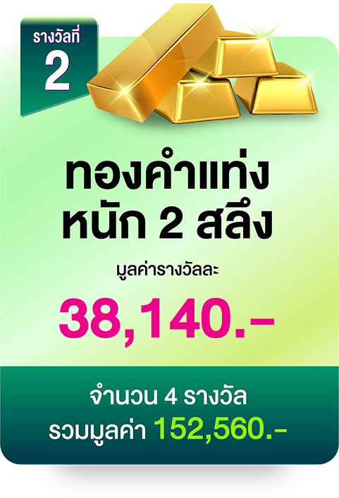 รางวัลที่ 2 : ทองคำแท่ง หนัก 2 สลึง จำนวน 4 รางวัล รางวัลละ 38,140 บาท รวมมูลค่า 152,560 บาท